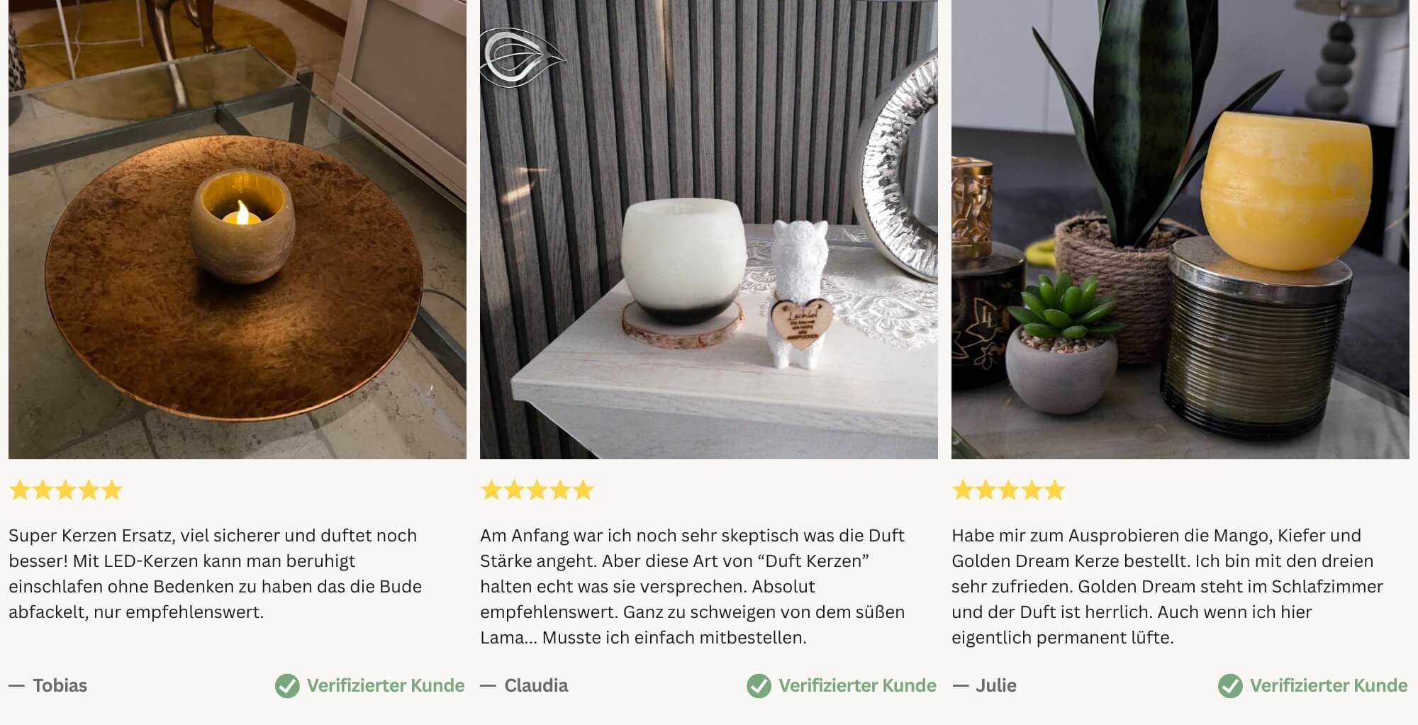 Ich habe bereits wiederholt diese Duftkerzen gekauft, für jeden Raum einen anderen Duft. Die Kerzen halten wie versprochen ein Jahr. Auch wenn man den Duft selbst nach einer Weile nicht mehr wahrnimmt sind es doch die Besucher die sich immer über den angenehmen Geruch in den einzelnen Räumen freuen und informieren. Der Verkäufer ist ein sehr netter Mann, der auch gut berät ohne einem etwas aufschwatzen zu wollen. Deshalb von mir 5 Sterne!