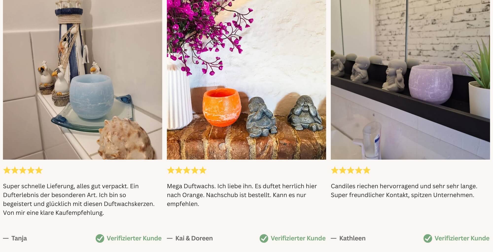 Ich liebe die Duftwachs Kerzen von Candiles. Düfte sind authentisch und sehr gut gearbeitet. Habe sie bereits weiterempfohlen und auch meine Schwester ist begeistert. Absolute Kaufempfehlung!